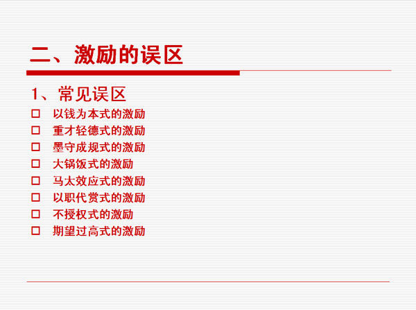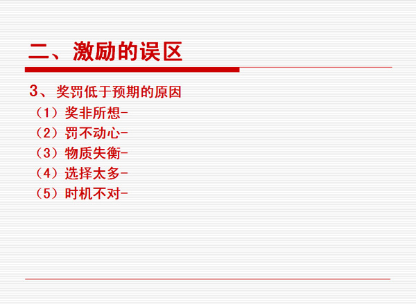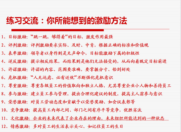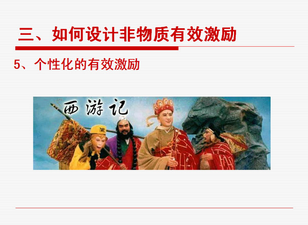 非物質(zhì)有效激勵(lì)很多人的第一反應(yīng)是不花錢,實(shí)際上世界上不花錢的東西是不存在的。而花同樣的錢辦不同的事,這是可以存在的。拿同樣的錢去產(chǎn)生不同的效益,這才是我們管理者應(yīng)該去思考的問題。