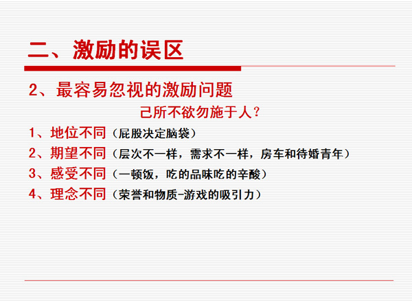 期望過高式的激勵(lì)——個(gè)人訴求不一樣的時(shí)候就必須考慮為什么己所不欲勿施于人。