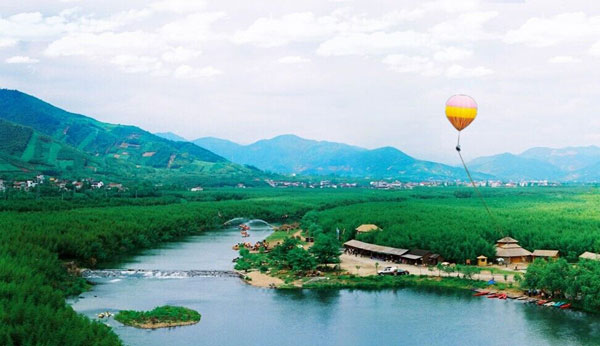 全長(zhǎng)水路3.5公里,歷時(shí)一小時(shí)左右,由專業(yè)筏工點(diǎn)篙撐筏,順莫干山、天目山支流匯合雙溪而下。溪水清澈明凈,水面時(shí)有翠鳥、鴨子等出沒,兩岸茶山蔥籠,淡竹林綿延不絕。溪邊有“苧翁垂釣”、“村姑搗衣”,實(shí)屬一幅天然水墨風(fēng)情畫,都市喧囂在此蕩然無(wú)存,令總裁們也卸下了平日繁重的工作包袱,與孩子們置身于秀美山水之間,盡情享受著天倫之樂。