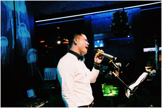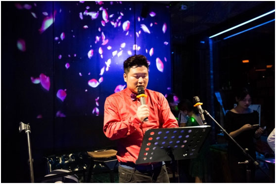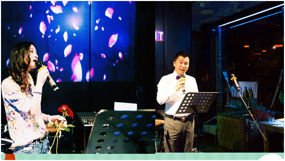 首先登場(chǎng)——共創(chuàng)會(huì)“頭牌巨星”海寧朗舜皮草有限公司總經(jīng)理諸為忠,演繹歌曲《聽(tīng)?!?,全場(chǎng)氣氛瞬間被點(diǎn)燃。