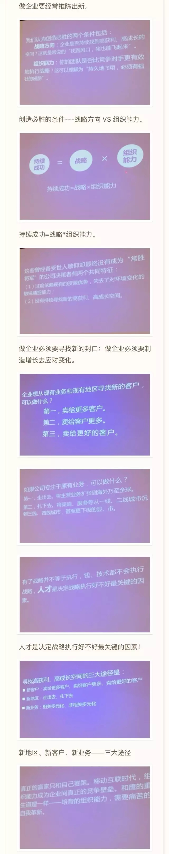 第三是企業(yè)的持續(xù)成功=戰(zhàn)略X組織能力。公司CEO一定要清楚公司的商業(yè)邏輯、組織構(gòu)架,從我5年淺顯的創(chuàng)業(yè)經(jīng)驗(yàn)來(lái)看,這兩點(diǎn)其實(shí)不是規(guī)劃出來(lái)的,而是邊做邊打版出來(lái)的。