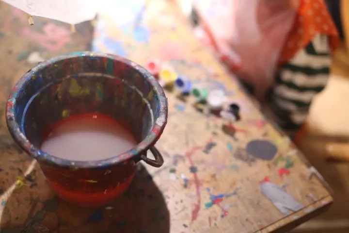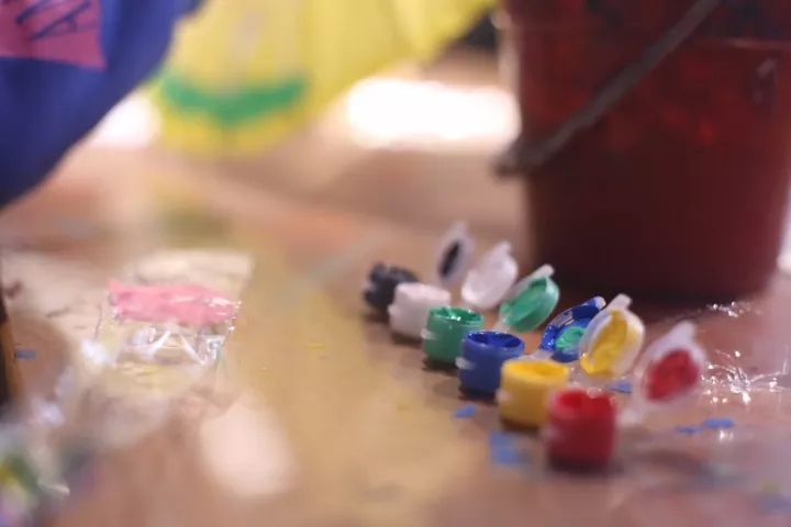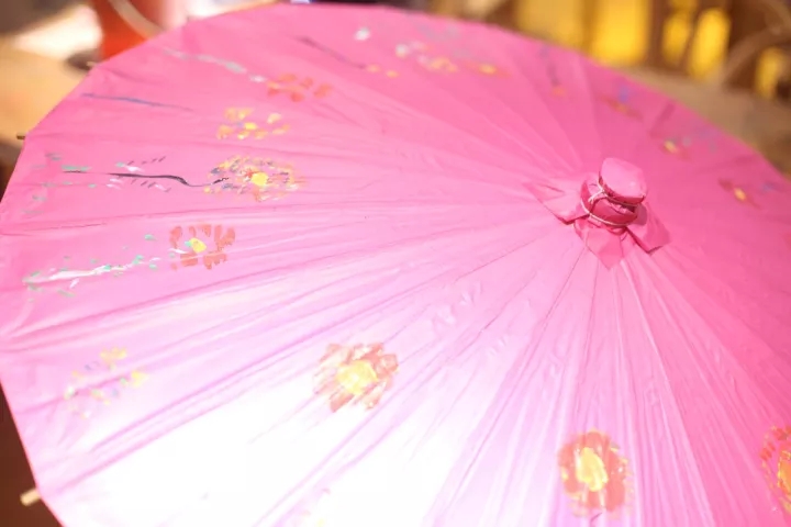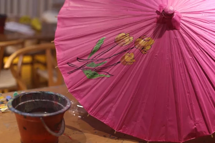 油紙傘DIY現(xiàn)場準備了空白的油紙傘、調(diào)色盤、涂料和畫筆等……