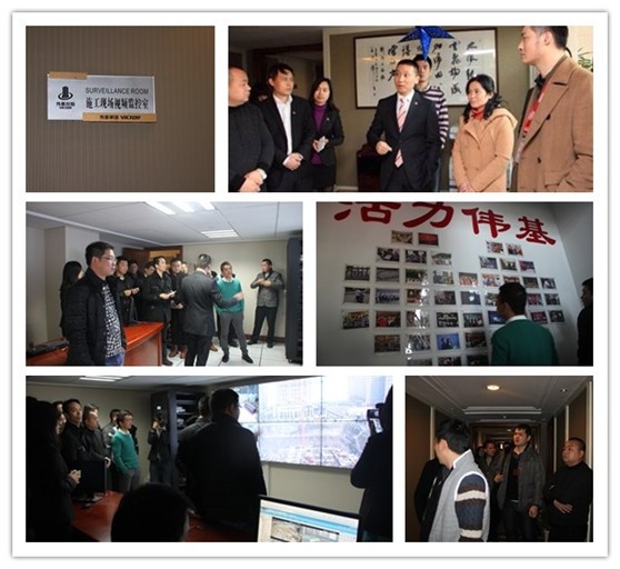 (上圖為虞董帶領大家參觀偉基集團。施工現(xiàn)場視頻監(jiān)控室是一大亮點,設備的先進性、科技的信息化、管理的一體化,以及對安全及進度輕松便捷的管控,都清晰明了地展現(xiàn)在眾人眼前,一目了然。一站式服務中心更是體現(xiàn)出了偉基的人性化,農民工兄弟收工下班回來就可以在這里休息,享受五星級的服務標準,這樣的員工關懷度,套句網(wǎng)絡用語:這可真是高大上的節(jié)奏!)