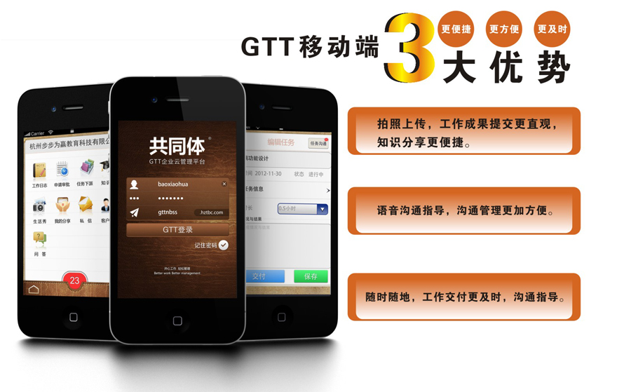 移動(dòng)互聯(lián)網(wǎng)已成為主流,更是大勢(shì)所趨,管理平臺(tái)的移動(dòng)應(yīng)用能很好的把使用者的碎片化時(shí)間利用起來,隨時(shí)隨地的開展工作與管理,移動(dòng)端是移動(dòng)辦公及移動(dòng)管理的載體體現(xiàn)。針對(duì)移動(dòng)端設(shè)備具有可隨身攜帶、屏幕小、多媒體承裁的特性,GTT移動(dòng)端增加了語(yǔ)音溝通指導(dǎo)、拍照附件提交、企業(yè)"微信"等功能,讓工作與管理變的更加及時(shí)連續(xù)、便捷有效。